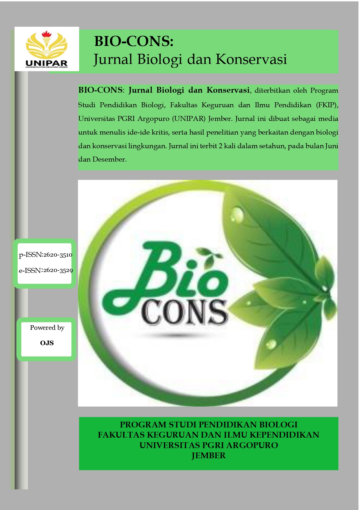 BIO-CONS: Jurnal Biologi dan Konservasi, published by the Biology Education Study Program, Faculty of Teacher Training and Education, University of PGRI Argopuro Jember. This journal was created as a medium for writing critical ideas, as well as research results related to biology and environmental conservation. This journal is published twice a year, in June and December.
